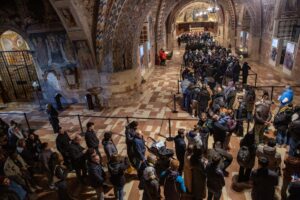 Pilgrims wait inside the Basilica of St. Francis of Assisi Feb. 22, 2026 to venerate the saint’s bones on display during the 800th anniversary commemorations of his death in Assisi, Italy. (CNS photo/courtesy of Sacred Convent in Assisi press)