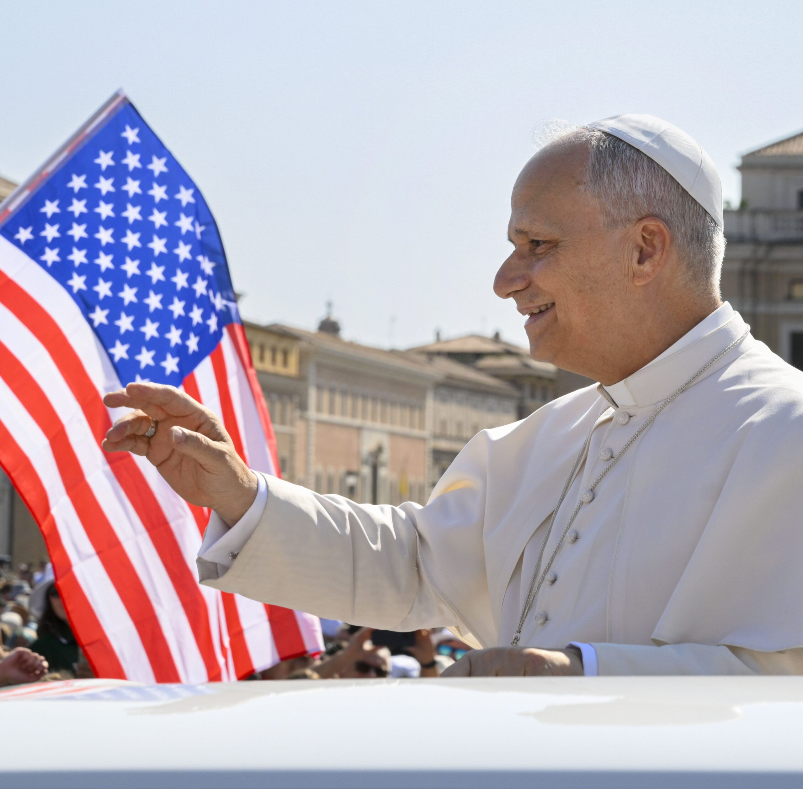 With a U.S. flag in the background, Pope Leo XIV waves to the crowd from the popemobile as he rides around St. Peter’s Square at the Vatican before his weekly general audience Aug. 6, 2025. As the U.S. marks its 250th anniversary, Pope Leo XIV, the first American pontiff in history, will receive the National Constitution Center’s Liberty Medal for his promotion of religious liberty, as well as freedom of conscience and expression. (CNS photo/Vatican Media)
