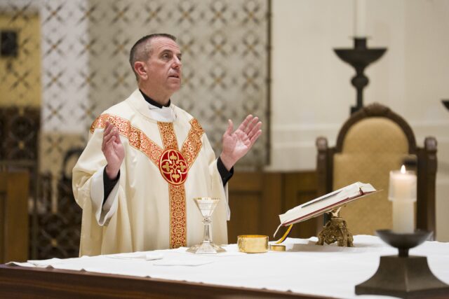 Jesuit Father Chris Collins, outgoing vice president of the University of St. Thomas in St. Paul, Minn., and parochial administrator of St. Peter Claver Church, celebrates Mass of healing for the St. Thomas community in the Chapel of St. Thomas Aquinas Jan. 27, 2026. A federal judge ruled March 20 that clergy must be allowed to provide spiritual care inside an ICE facility in Minneapolis, siding with an ecumenical group of Minnesota clergy, which included Father Collins, who filed suit in February after being barred from accessing the facility multiple times. (OSV News photo/Mark Brown, courtesy University of St. Thomas)