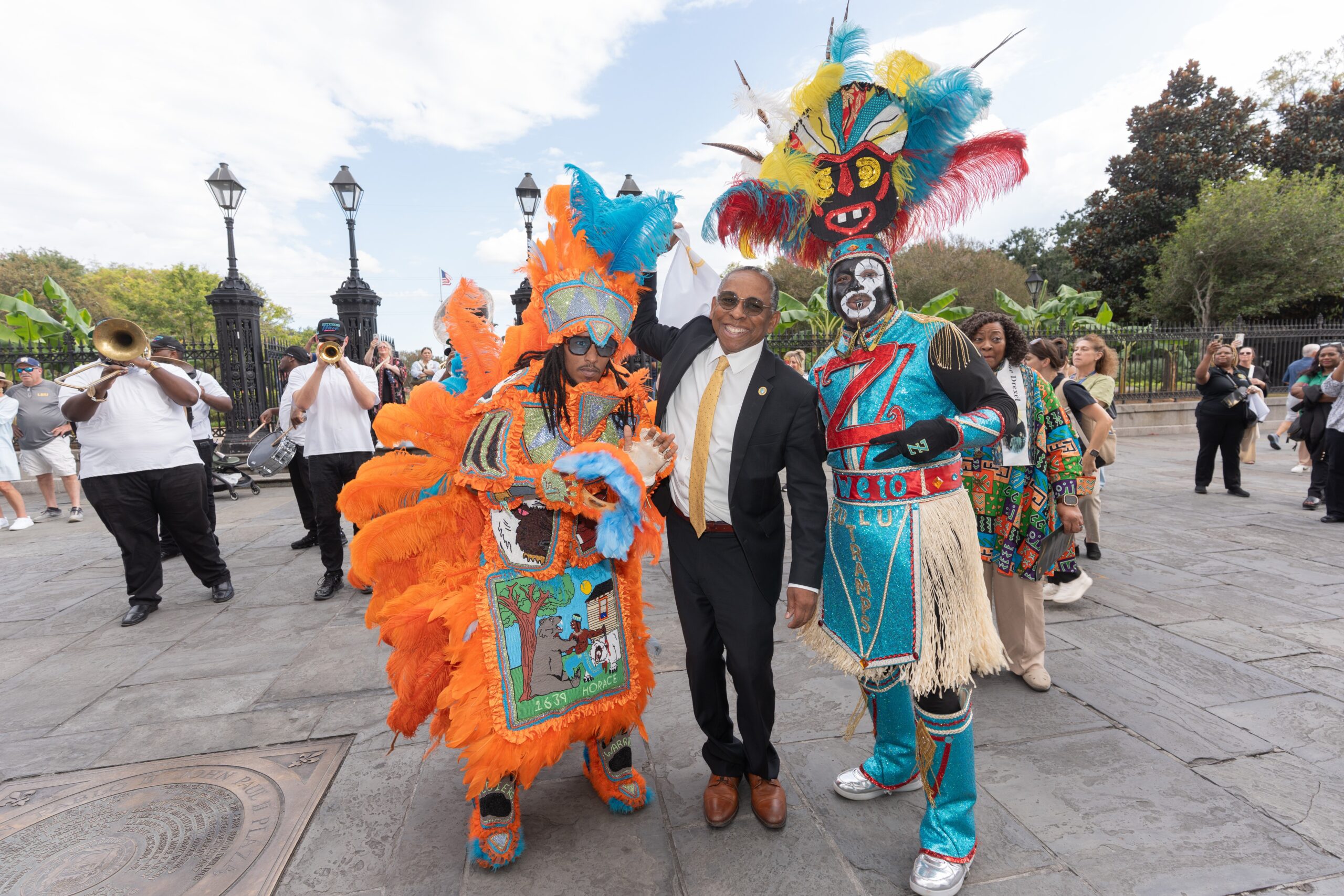 Reynold Verret, president of Xavier University of Louisiana in New Orleans, poses with members of the masking community following the centennial Mass for the university at St. Louis Cathedral in New Orleans Oct. 1, 2025. Community members are African Americans known for their elaborate outfits and participation in Mardi Gras. Their aesthetic is an expression of their culture, religion and spirituality. (OSV News photo/Gavin Goins, courtesy Xavier University of Louisiana)