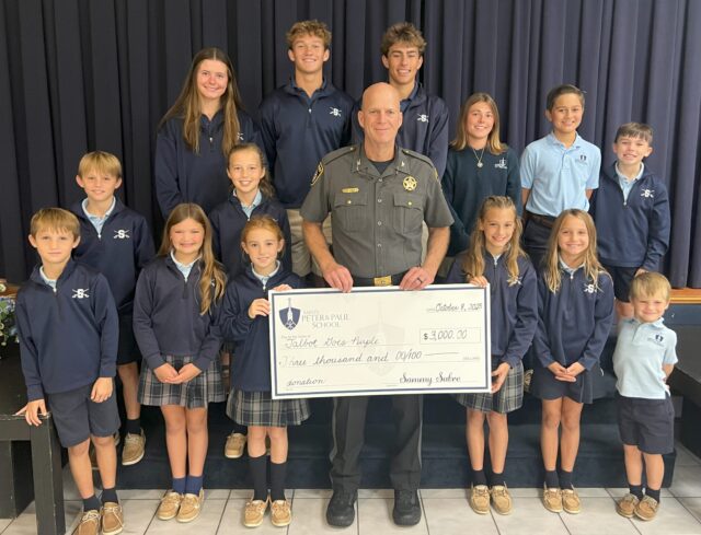 On Oct. 8, SS. Peter and Paul representatives presented a check to Talbot County sheriff Joe Gamble, who leads the Talbot Goes Purple initiative. Gamble visited the schools in recent weeks to discuss the impact of addiction and how prevention begins with education and awareness.