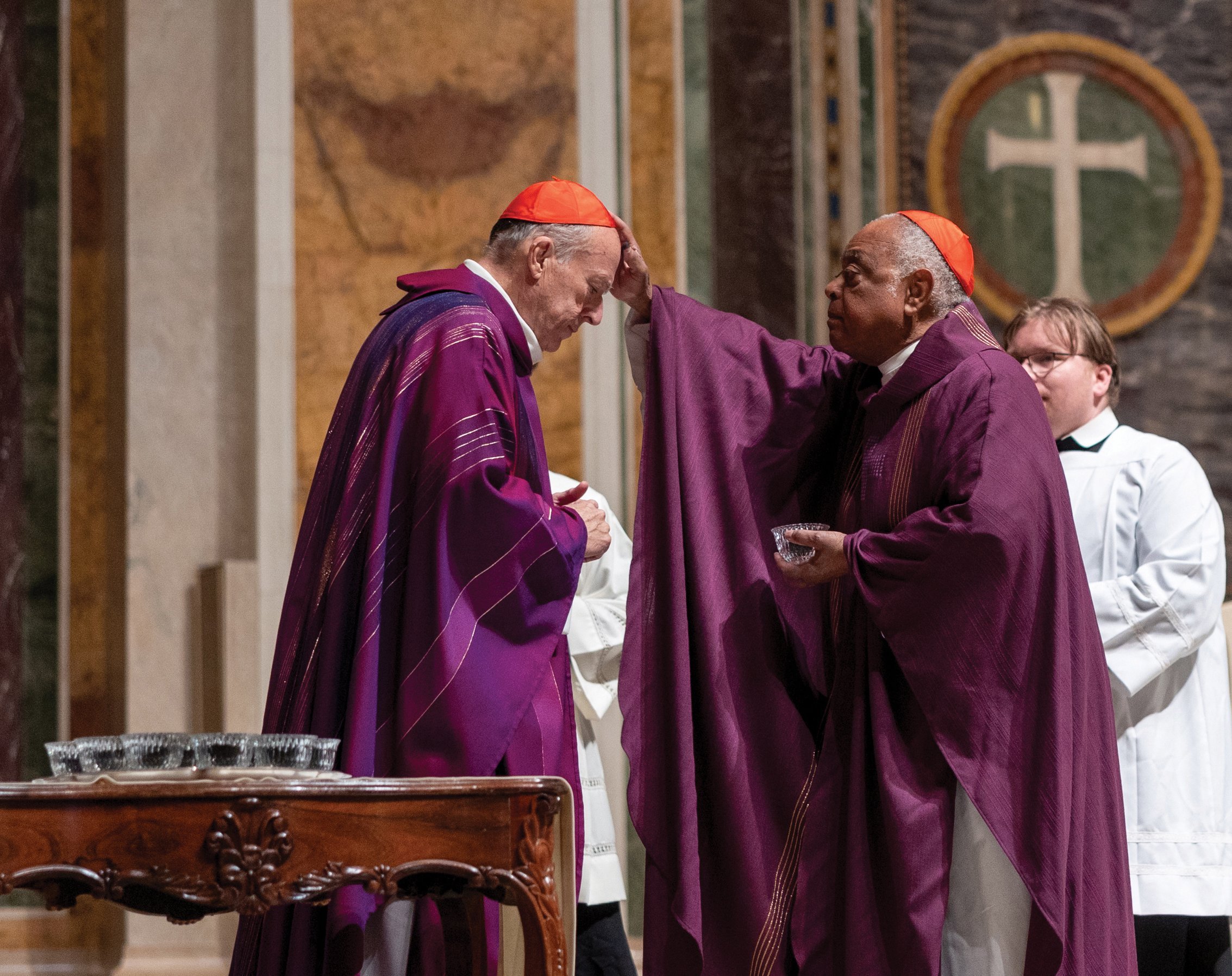 Cardinal Wilton D. Gregory, right, the retired archbishop of Washington, dispenses ashes to Cardinal Robert W. McElroy during Ash Wednesday Mass March 5, 2025, at the Cathedral of St. Matthew the Apostle in Washington. The Archdiocese of Washington announced Nov. 5 that Cardinal McElroy, installed as Washington’s archbishop March 11, has been diagnosed with cancer, to be surgically removed Nov. 13. The archdiocese said the cardinal has “well-differentiated liposarcoma,” a non-aggressive cancer “that tends not to metastasize.” (OSV News photo/Mihoko Owada, Catholic Standard)