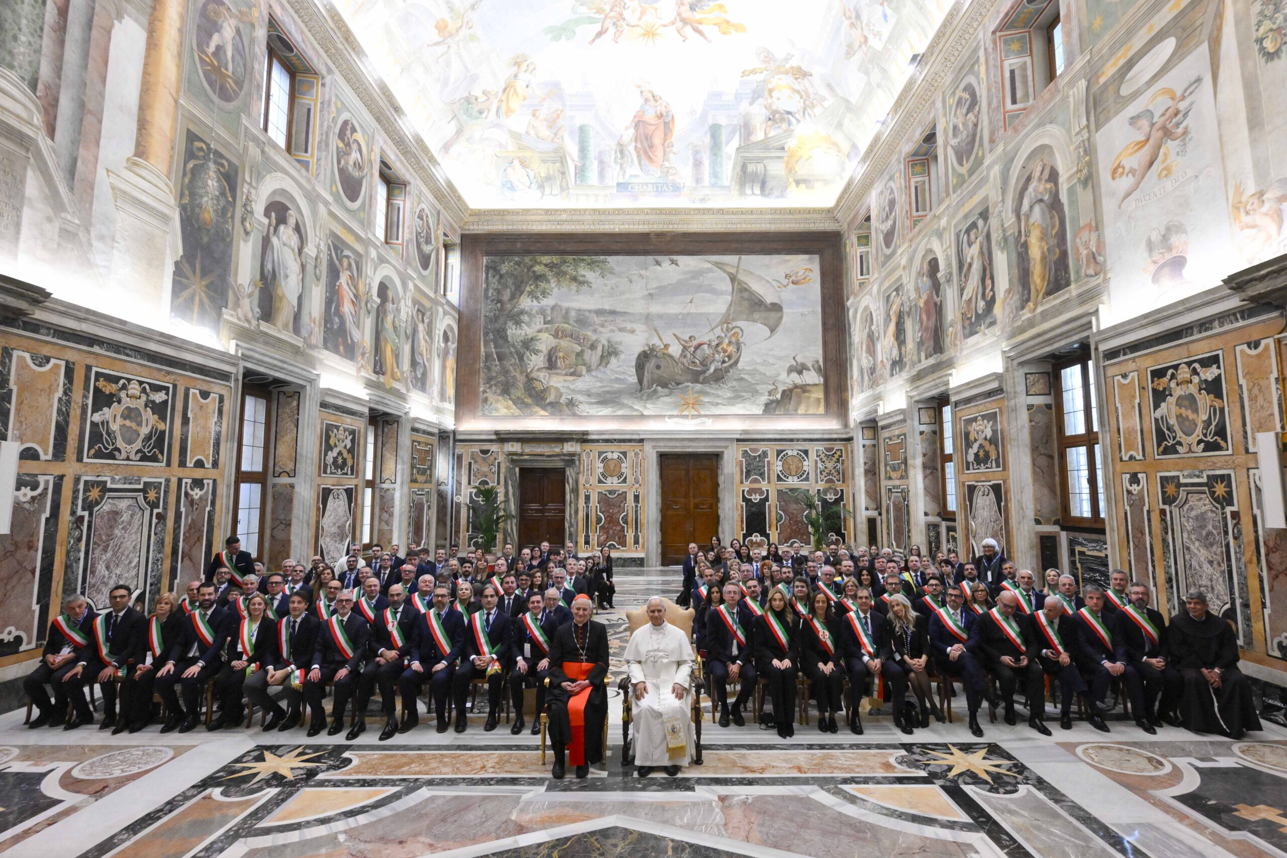 Pope Leo XIV poses for a photo with members of the National Association of Italian Municipalities during an audience at the Vatican Dec. 29, 2025. To the left of the pope sits Cardinal Matteo Zuppi, president of the Italian Bishops’ Conference. (CNS photo/Vatican Media)