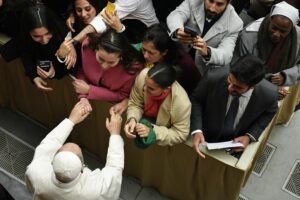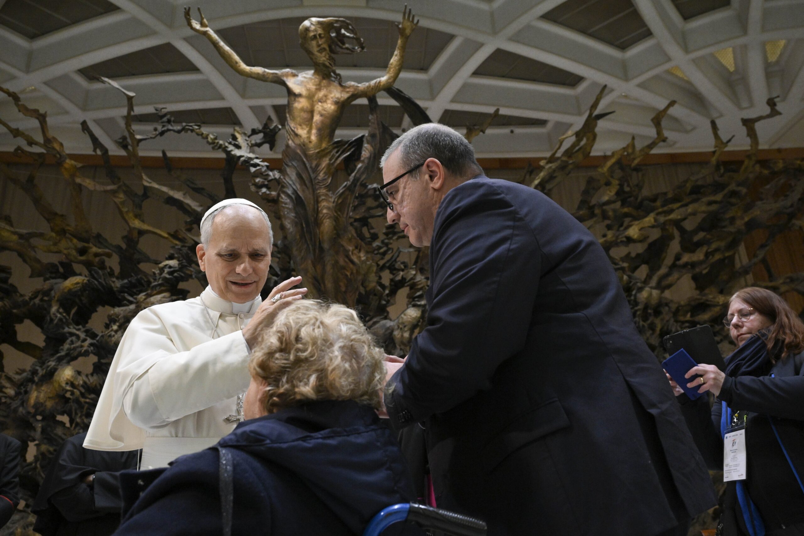 Pope Leo XIV blesses a woman during his weekly general audience in the Paul VI Audience Hall at the Vatican Jan. 28, 2026. (OSV News photo/Simone Risoluti, Vatican Media)