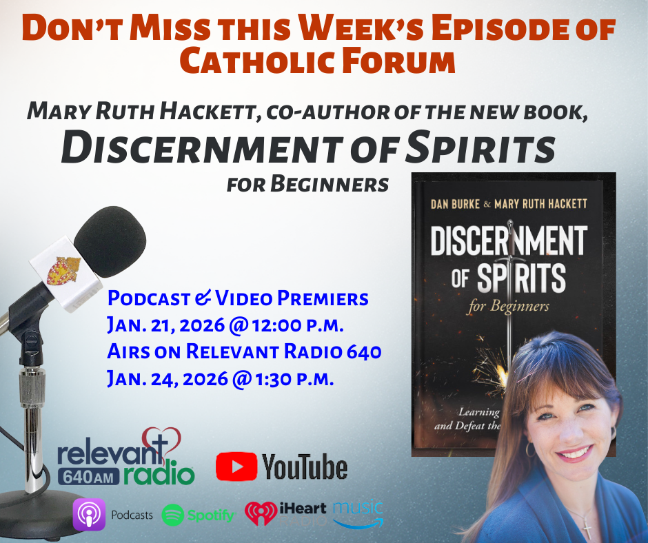 On this Catholic Forum interview, we talk with educational psychologist, Dr. Mary Ruth Hackett, about her new book with Dan Burke, titled “Discernment of Spirits for Beginners: Learning to Hear God and Defeat the Lies of the Enemy.”