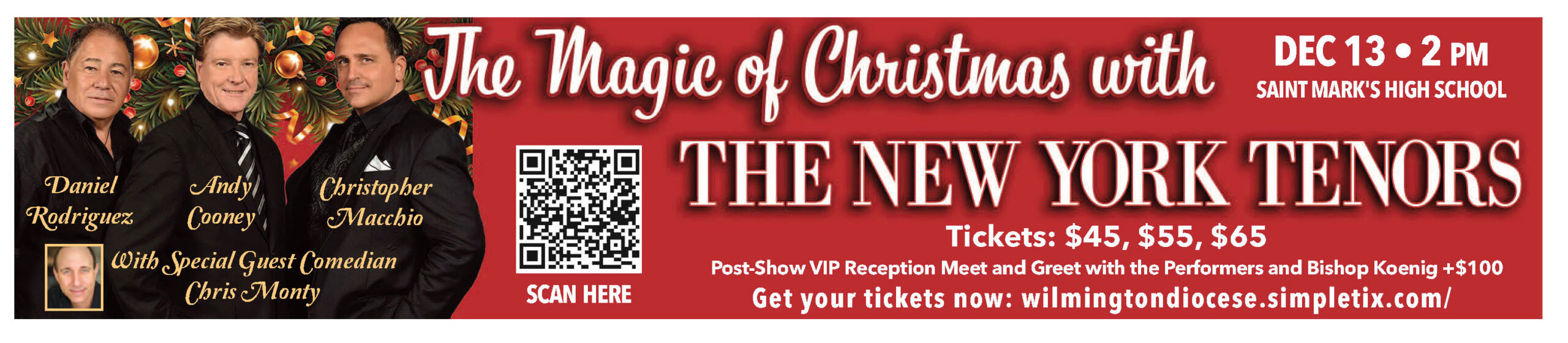 Dec. 13, 2 p.m. The Magic of Christmas with the New York Tenors, St. Mark’s High School Theater, 2501 Pike Creek Road, Wilmington. Benefits Catholic Charities. Sponsorships available. Tickets $45, $55, or $65. All Seats Reserved. Cocktail reception after the concert with the Tenors and Bishop Koenig for an additional $100. Purchase tickets here: wilmingtondiocese.simpletix.com/