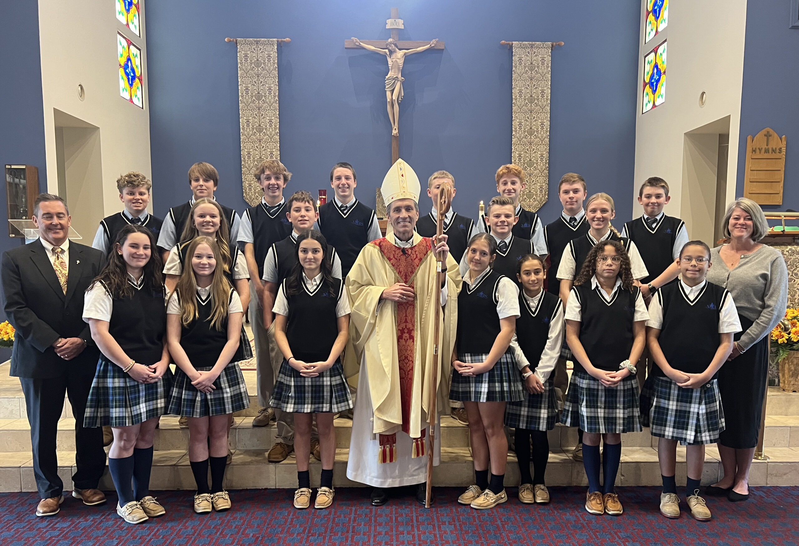 At the end of the celebration, members of the student council presented the bishop with a special gift on behalf of the entire school community, expressing appreciation for his leadership and his visit.