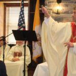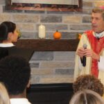 A full house greeted the bishop, who was making his first trip to Holy Cross. The 20 students, many of whom had roles in the Mass, were joined by several priests and a deacon, board members, staff and a few parents. The main room inside Holy Cross was rearranged to accommodate the crowd.