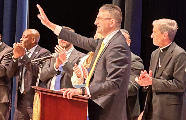 The swearing-in of Delaware Gov. Matthew S. Meyer and Lt. Gov. Kyle Evans Gay happened Jan. 21 moments after Bishop William E. Koenig of the Diocese of Wilmington offered the invocation.