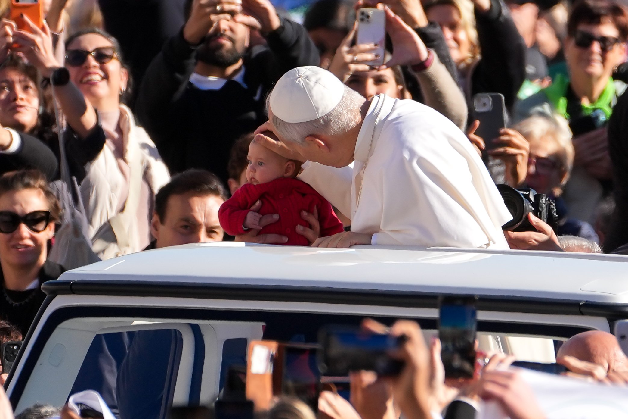 Pope Leo XIV greets a child from the popemobile as he rides around St. Peter’s Square at the Vatican before his weekly general audience Nov. 5, 2025. (CNS photo/Lola Gomez)