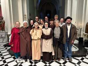 Teenagers and parents dressed as Catholic saints celebrate a Holywins festival in the Sanctuary of St. Juliana of Cornillon, better known as Juliana of Liege, in Belgium, Oct. 29, 2023. Across Europe, Catholic families are turning Halloween into a celebration of light, life and holiness with “Holywins” — a play on “Holy” and “Halloween.” The movement began in Paris in 2002 and has since spread to Poland, Belgium, Italy, Spain and beyond. (OSV News photo/courtesy Holywins Liege)