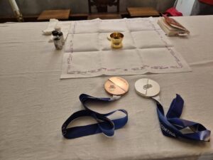 Catholic influencers around the world shared Father Plen’s pictures of Tomasiak’s medals laying on the altar during Mass in a Predazzo Church chapel.