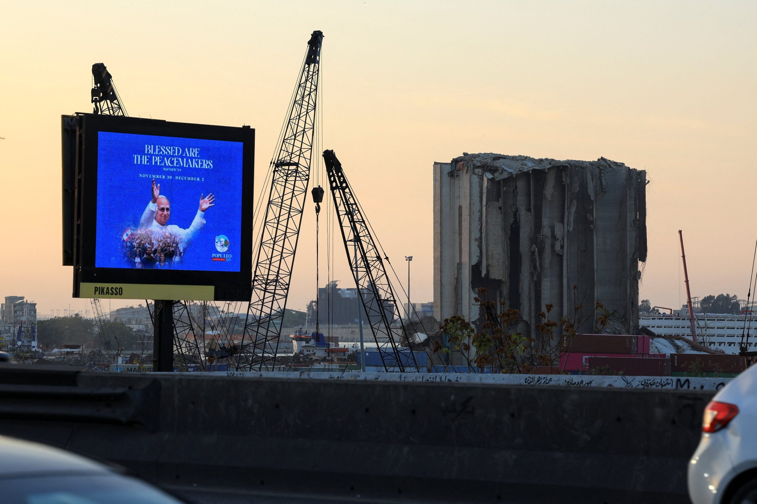 A digital billboard showing Pope Leo XIV stands along a road in Beirut Nov. 19, 2025, ahead of his planned visit to Lebanon. Nearby are partially collapsed grain silos that were damaged in the Aug. 4, 2020, Beirut port blast. (OSV News photo/Mohamed Azakir, Reuters)