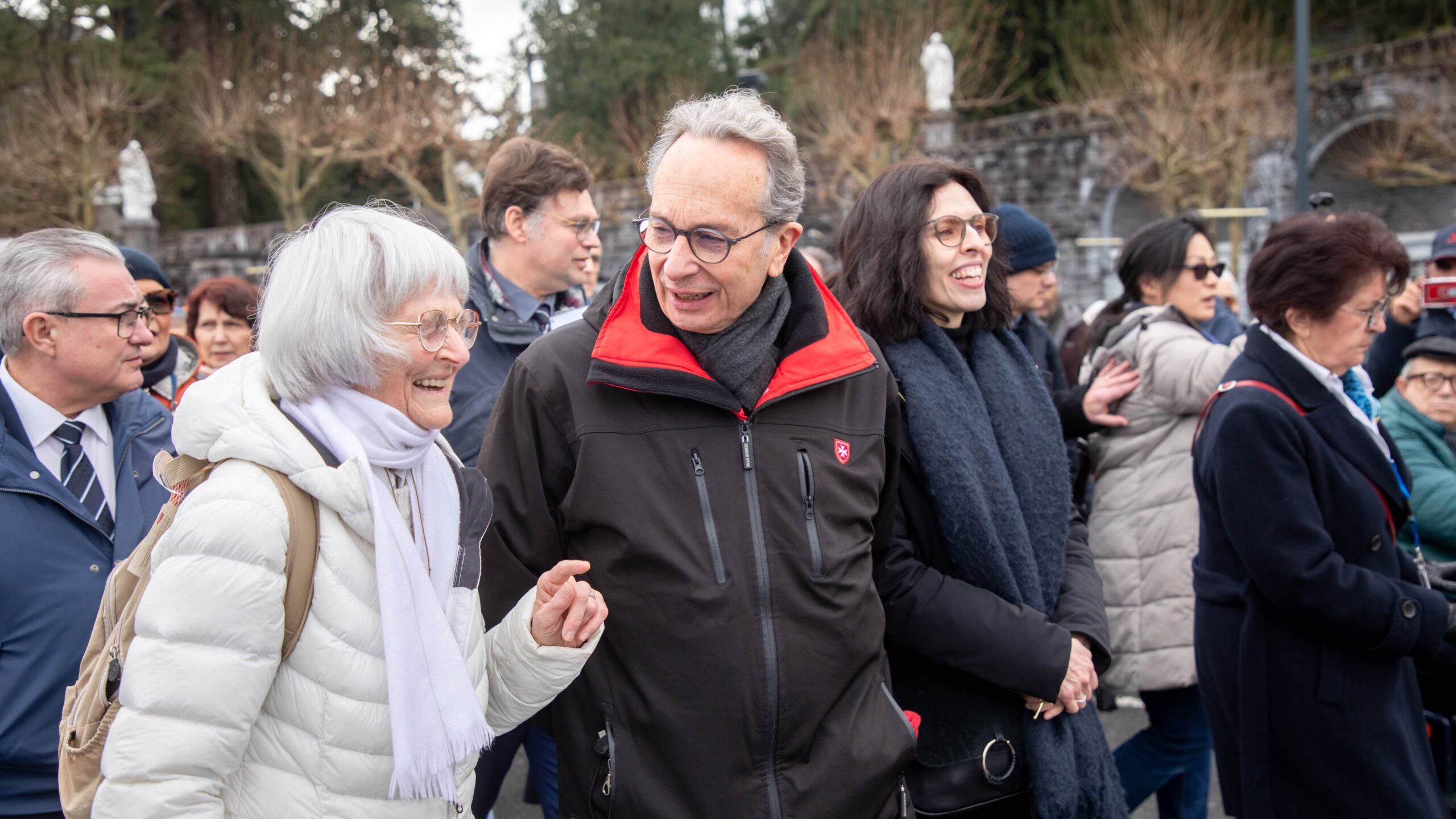 Dr. Alessandro de Franciscis, outgoing director of the Office of Medical Observations at the Lourdes Sanctuary in France, is pictured at the sanctuary Feb. 11, 2026, the feast of Our Lady of Lourdes. The Italian American physician, 70, who has headed the medical office for the past 17 years, retired on the feast day. His successor is Italian surgeon Giada Monami, walking on de Franciscis’ left side. She will be the first woman to head the medical office in the shrine’s history. (OSV News photo/courtesy Lourdes Sanctuary)