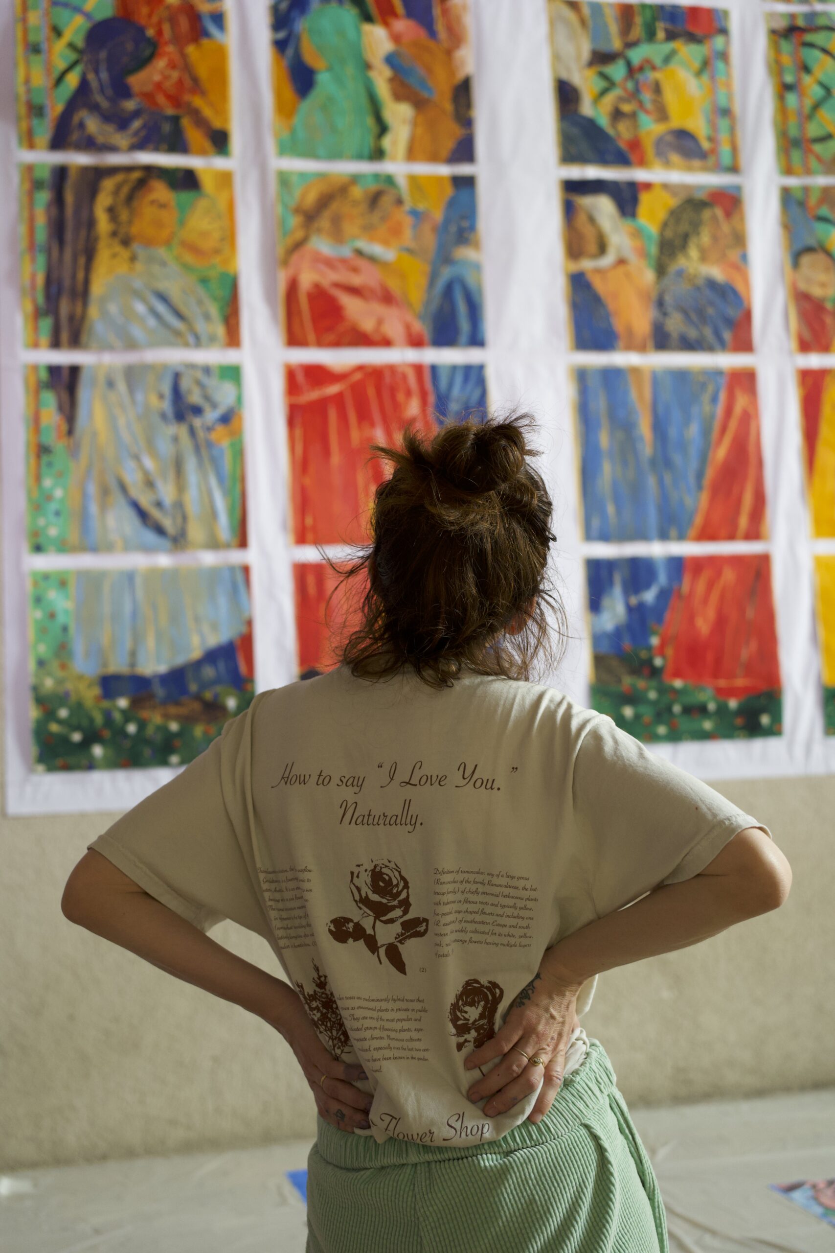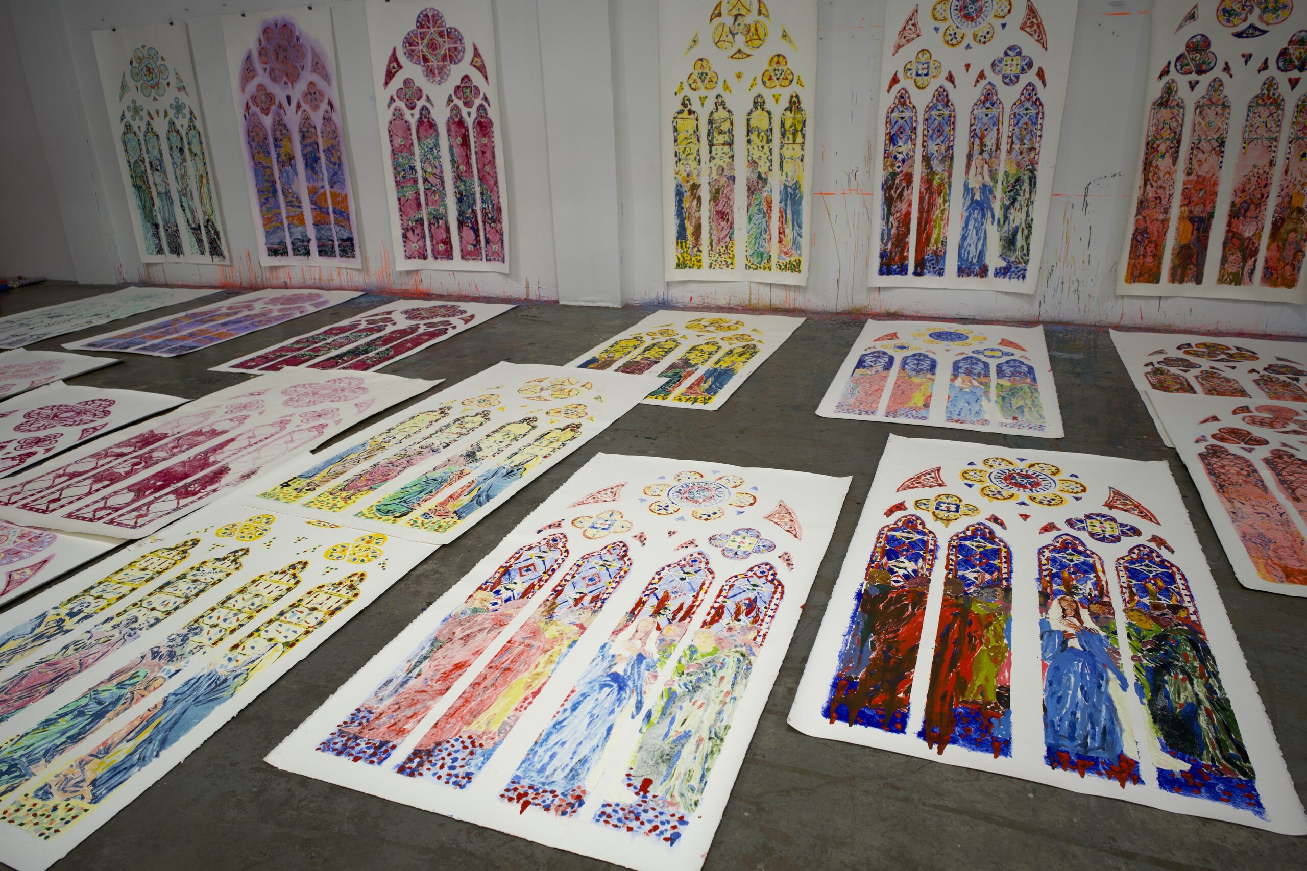Tabouret, a 44-year-old French painter of international renown, lives between France and Los Angeles. Her stained-glass windows models depict the descent of the Holy Spirit upon the disciples and the Virgin Mary, as described in the Acts of the Apostles. Prints on display are figurative works nearly 23 feet high and 13 feet wide.