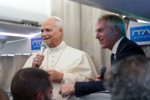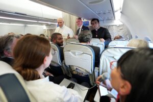 Pope Leo XIV answers a question from a journalist aboard his flight back to Rome from Lebanon, Dec. 2, 2025. (CNS photo/Lola Gomez)