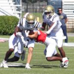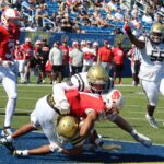 A pair of Sals defenders tackle the Eagles' Phoenix Henriquez in the end zone, resulting in a safety on Oct. 4 at Delaware Stadium. Dialog photo/Mike Lang
