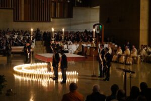 The Mass also included the annual tradition where the cathedral lights were dimmed and Mass participants carried hundreds of white candles, one by one, and placed them on the altar, representing the lives that were lost to abortion that day in the greater Los Angeles area.