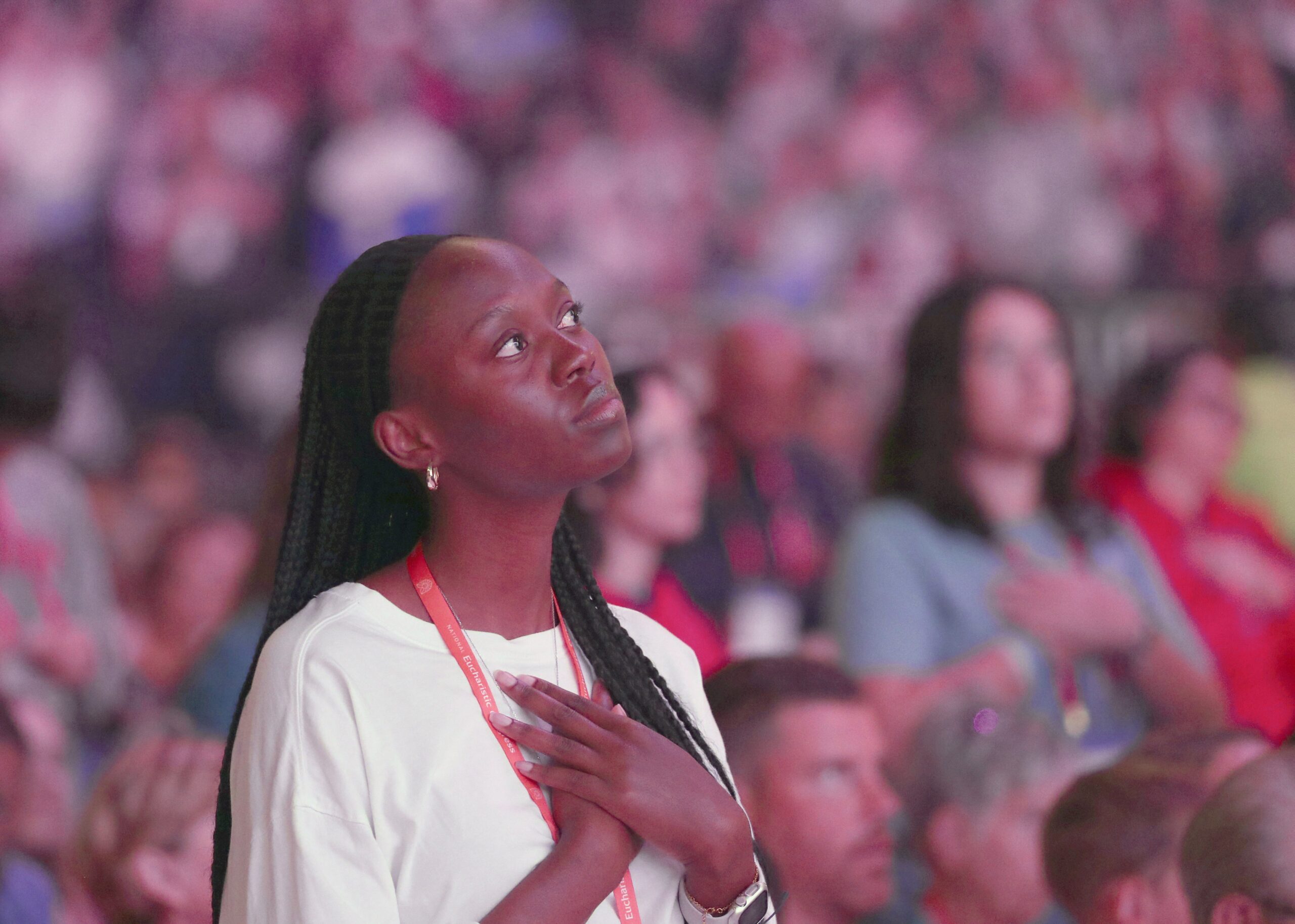A young woman prays July 19, 2024, during the third revival night of the National Eucharistic Congress at Lucas Oil Stadium in Indianapolis. (OSV News photo/Bob Roller)