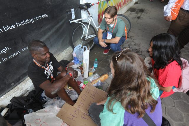 Pilgrims engage with a man suffering homelessness July 19, 2024, outside Lucas Oil Stadium during the National Eucharistic Congress in Indianapolis. (OSV News photo/Bob Roller)