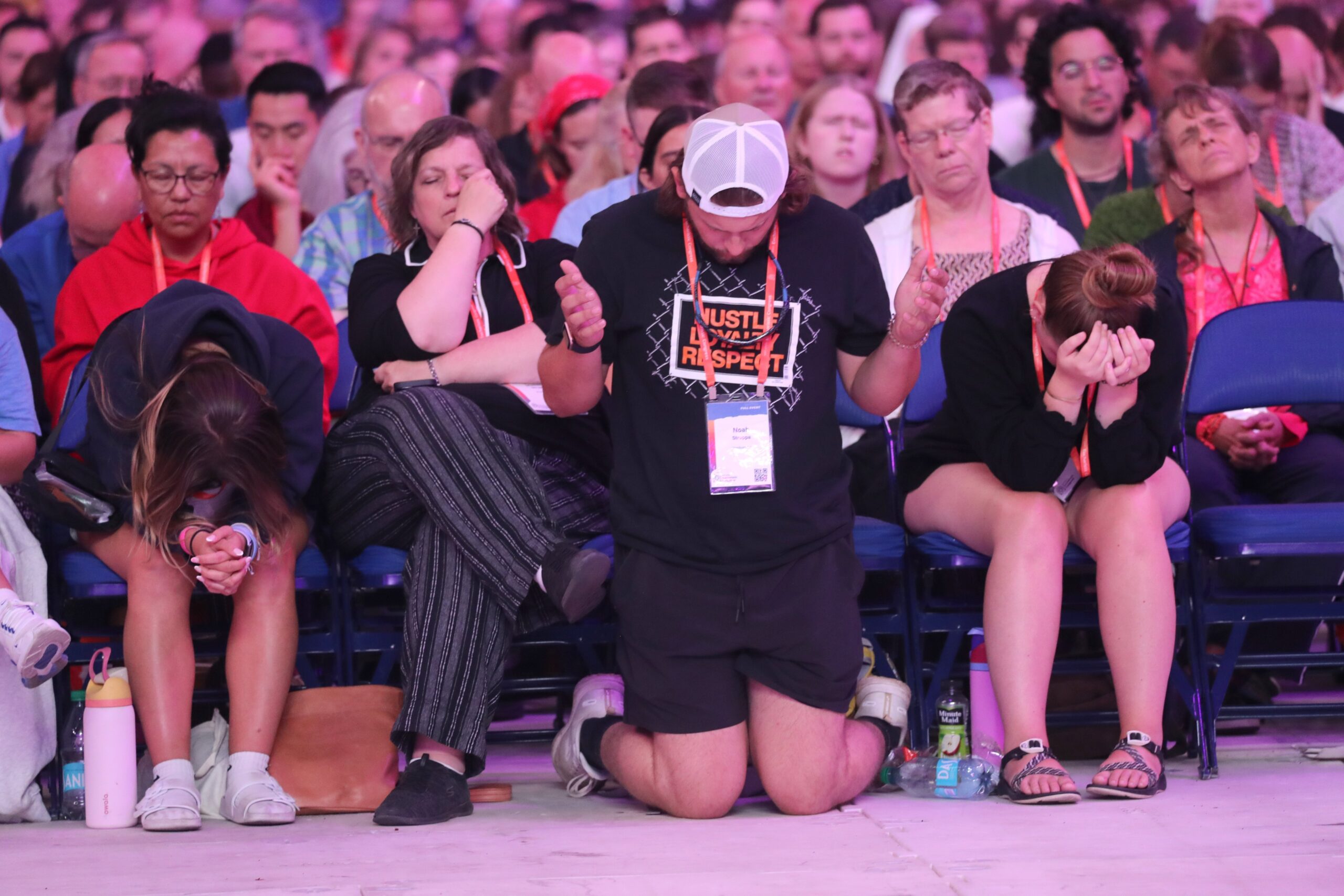 Pilgrims pray during a July 19, 2024, Encounter impact session at Lucas Oil Stadium during the National Eucharistic Congress in Indianapolis. (OSV News photo/Bob Roller)