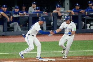 Toronto Blue Jays right fielder Addison Barger (47) celebrates with first base coach Mark Budzinski (53) as he rounds the bases after hitting a grand slam against the Los Angeles Dodgers in the sixth inning during game one of the 2025 MLB World Series at Rogers Centre in Toronto Oct. 24. A devout Catholic, Budzinski, 42, has long said that his relationship with God sustains him through every inning – from the joy of victory to the pain of loss. Mandatory Credit: (OSV News photoKevin Sousa-Imagn Images via Reuters)
