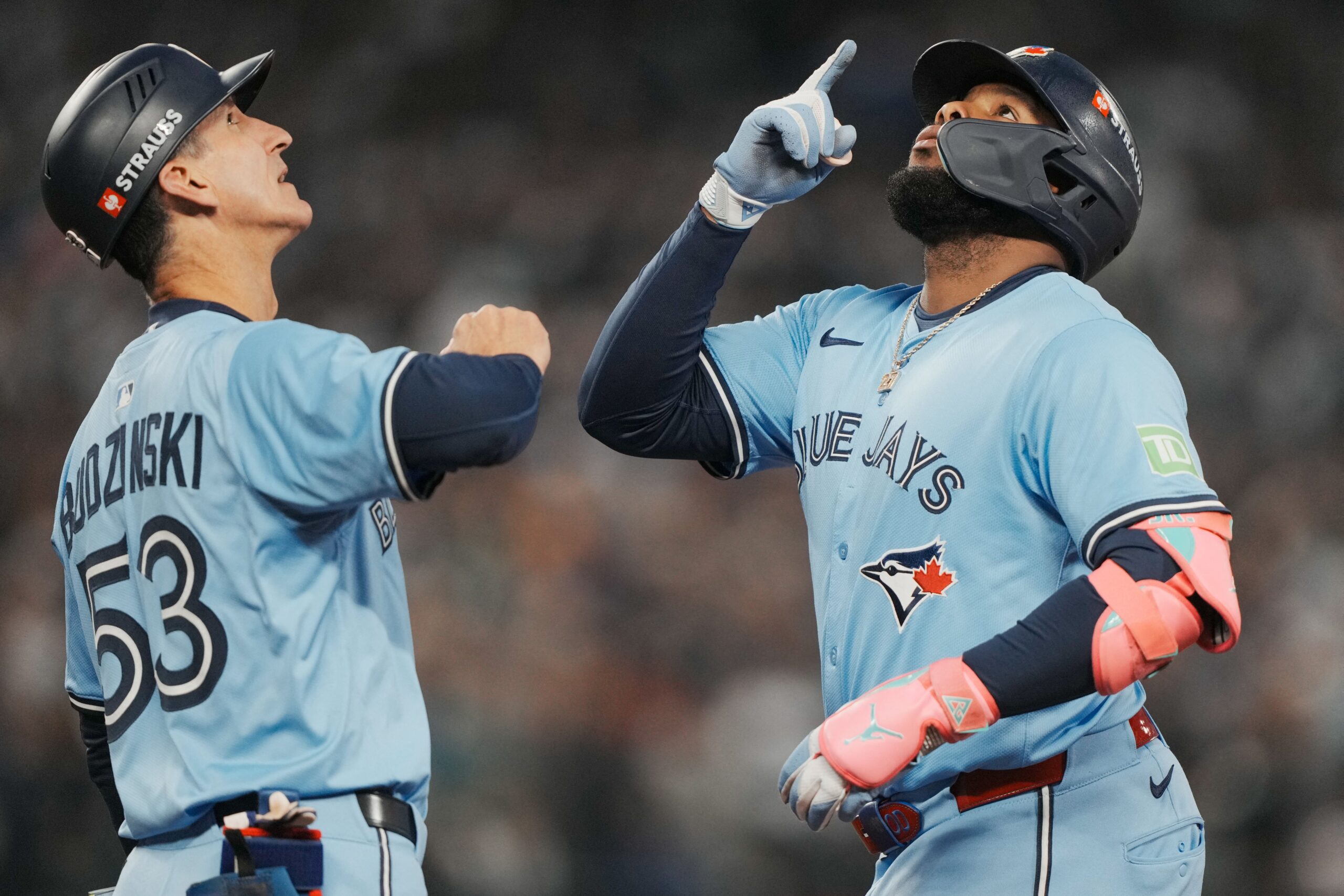 Toronto Blue Jays first baseman Vladimir Guerrero Jr. (27) celebrates with first base coach Mark Budzinski (53) after hitting a single against the Seattle Mariners in the third inning during game four of the ALCS round for the 2025 MLB playoffs at T-Mobile Park in Seattle Oct. 16. A devout Catholic, Budzinski, 42, has long said that his relationship with God sustains him through every inning – from the joy of victory to the pain of loss. Mandatory Credit: (OSV News photo/Stephen Brashear-Imagn Images va Reuters)