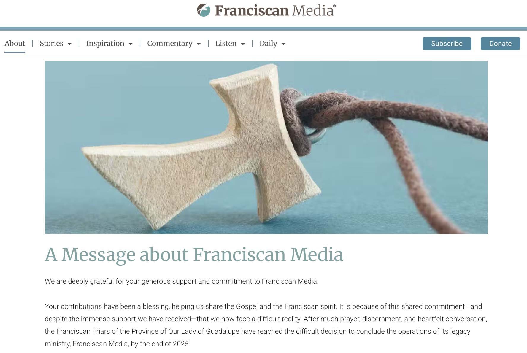 “After much prayer, discernment, and heartfelt conversation, the Franciscan Friars of the Province of Our Lady of Guadalupe have reached the difficult decision to conclude the operations of Franciscan Media as of the end of 2025,” said the outlet in a message posted to its website and emailed to supporters Dec. 5.