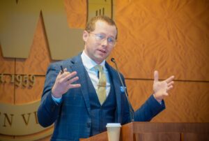 Dr. Ashley K. Fernandes, clinical professor of pediatrics at Nationwide Children’s Hospital in Columbus, Ohio, and associate director of the Center for Bioethics at the Ohio State University College of Medicine in Columbus, spoke about the tension between medicine and business during his keynote, “Hard Days but Never Bad Days: Finding Moral Meaning in the Business of Health Care.”
