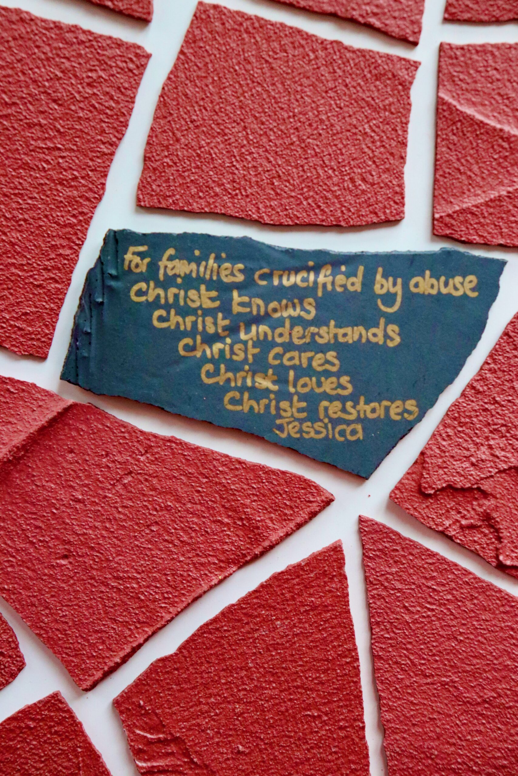 On the back of each piece of the mosaic are prayers, names and messages from survivors and those who assist survivors of abuse in different countries around the world.