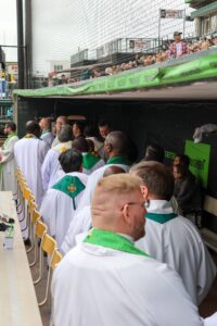 Confession was available on the second deck of the stadium on the third base side until 1 p.m. Around 1:30 p.m., Catholic schoolchildren paraded around the field.