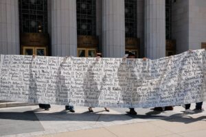 Parents who say they have lost their children due to social media hold up a banner with the children’s names outside a Los Angeles court March 25, 2026, after the jury found Meta and Google liable in a key test case accusing Meta and Google’s YouTube of harming children’s mental health through addictive social media platforms. (OSV News photo/Mike Blake, Reuters)