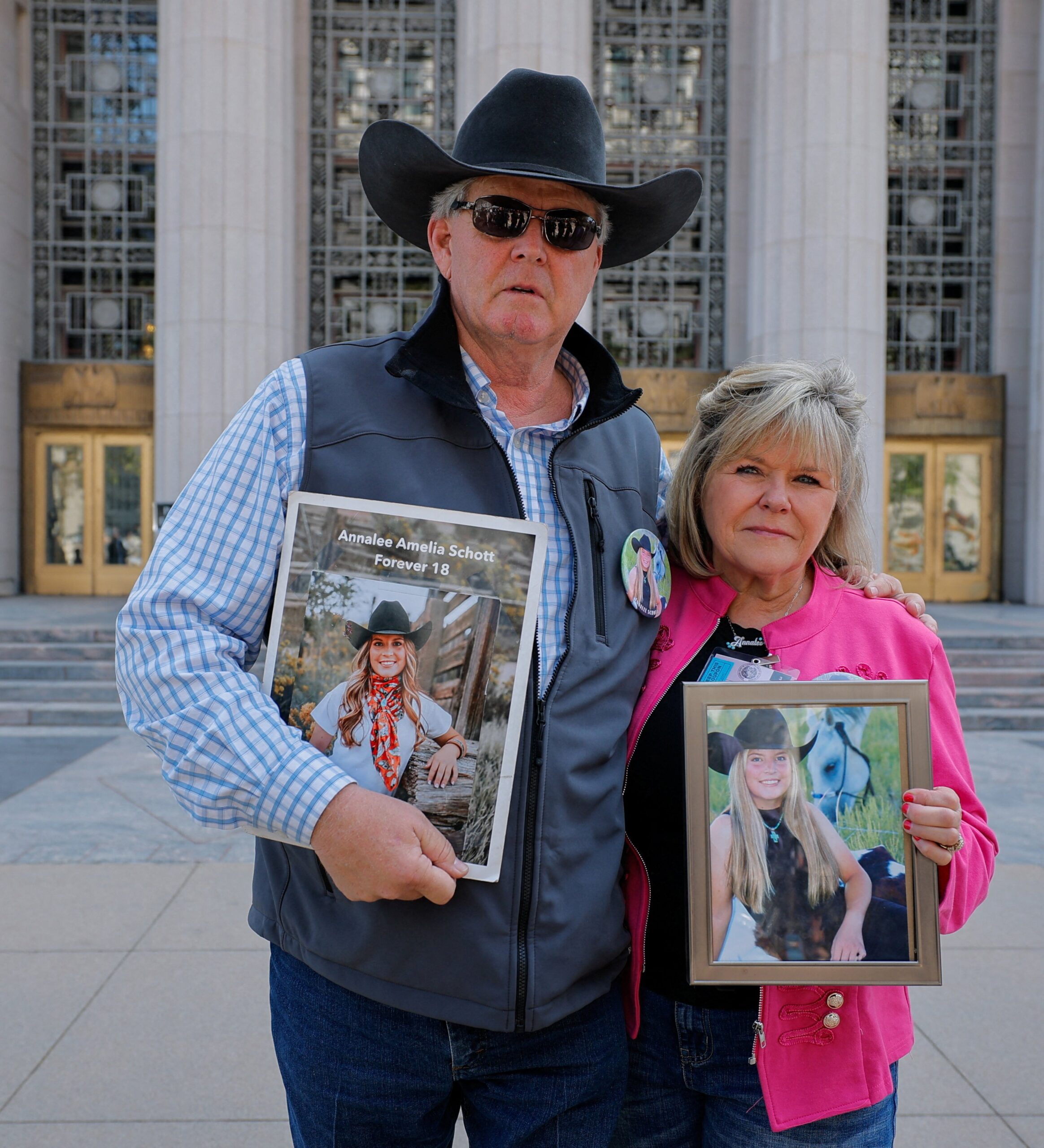 Avery and Lori Schott hold pictures of their late daughter Annalee as they pose outside a Los Angeles court March 25, 2026, after the jury found Meta and Google liable in a key test case accusing Meta and Google’s YouTube of harming children’s mental health through addictive social media platforms. The Schotts said Annalee took her own life at age 18 in 2020 after social media algorithms worsened her anxiety and depression. (OSV News photo/Mike Blake, Reuters)