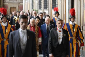 From the moment the royal couple arrived Oct. 23 in the San Damaso Courtyard of the Apostolic Palace, the high formality of the official visit was clear as a larger-than-usual contingent of Swiss Guards welcomed the king and queen, and the Vatican police band played the Vatican anthem and “God Save the King,” which is the British national anthem.