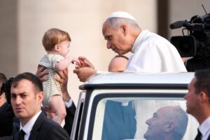 Pope Leo XIV greets a child from the popemobile as he rides around St. Peter’s Square at the Vatican before his weekly general audience Oct. 15, 2025. (CNS photo/Lola Gomez)